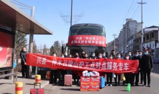 3月10日,興縣20余名呂梁山護工乘坐“外出務工”點對點就業服務直通車,奔往陜西省神木市返崗就業。