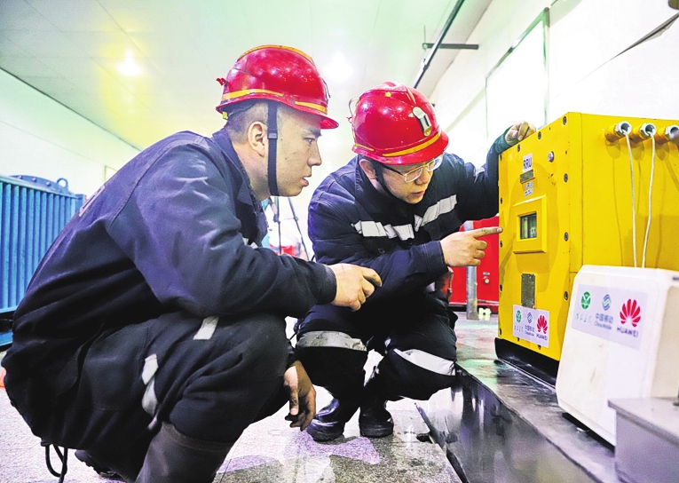 Workers test a 5G monitoring device in Xinyuan’s shaft.PHOTOS BY YE HAIFENG / FOR CHINA DAILY