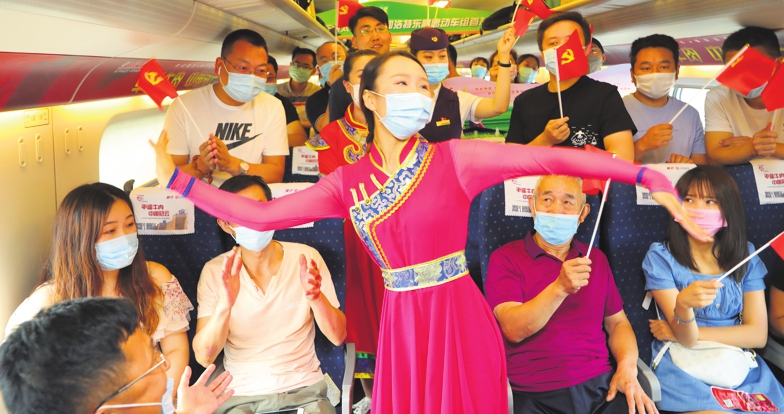 A crew member entertains passengers on the inaugural bullet train from Taiyuan to Hohhot with Mongolian folk song and dance. PROVIDED TO CHINA DAILY