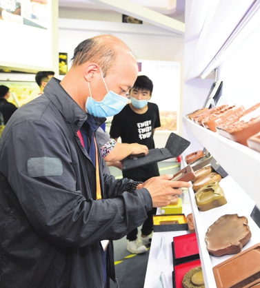 A visitor checks a chengni ink slab exhibited at the China International Fair for Trade in Service. RUAN YANG / FOR CHINA DAILY