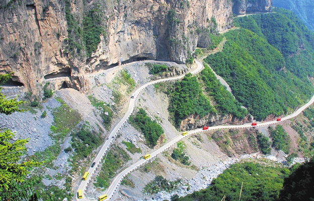 The 7.5-kilometer road to Xiyagou,which cuts through cliffs,is regarded as an engineering miracle.