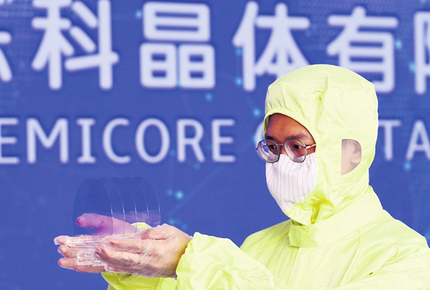 A staff member of Semicore Crystal shows the company\'s cutting-edge 6-inch silicon carbide chip.