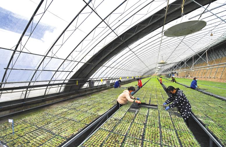 Farmers work at a modernized greenhouse for crop seedling cultivation.LI ZHAOMIN / FOR CHINA DAILY