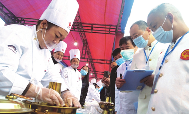 Trainees from a vocational school in Xinjiang county compete in a local cooking contest. GAO JIANHUA/FOR CHINA DAILY