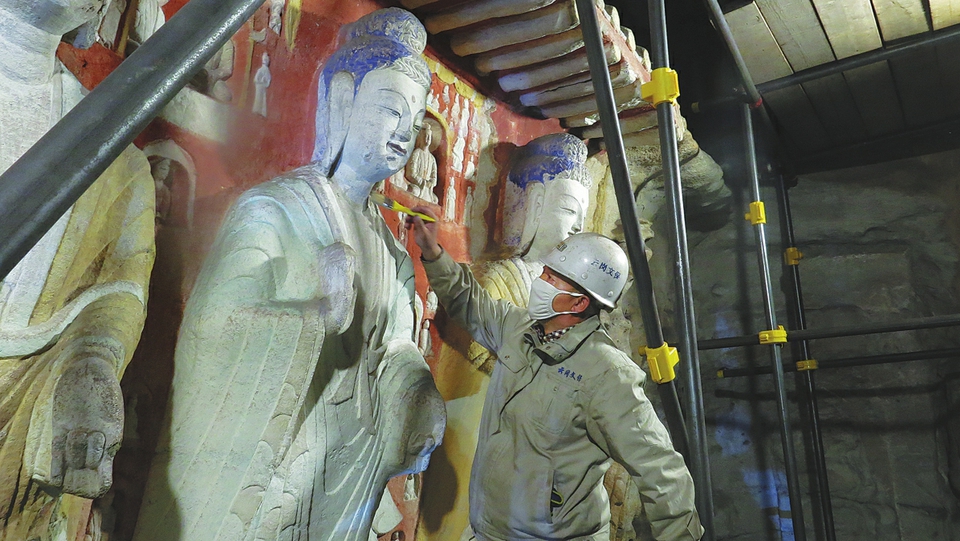 A technician works to preserve the statues at Yungang Grottoes in Shanxi province.PROVIDED TO CHINA DAILY