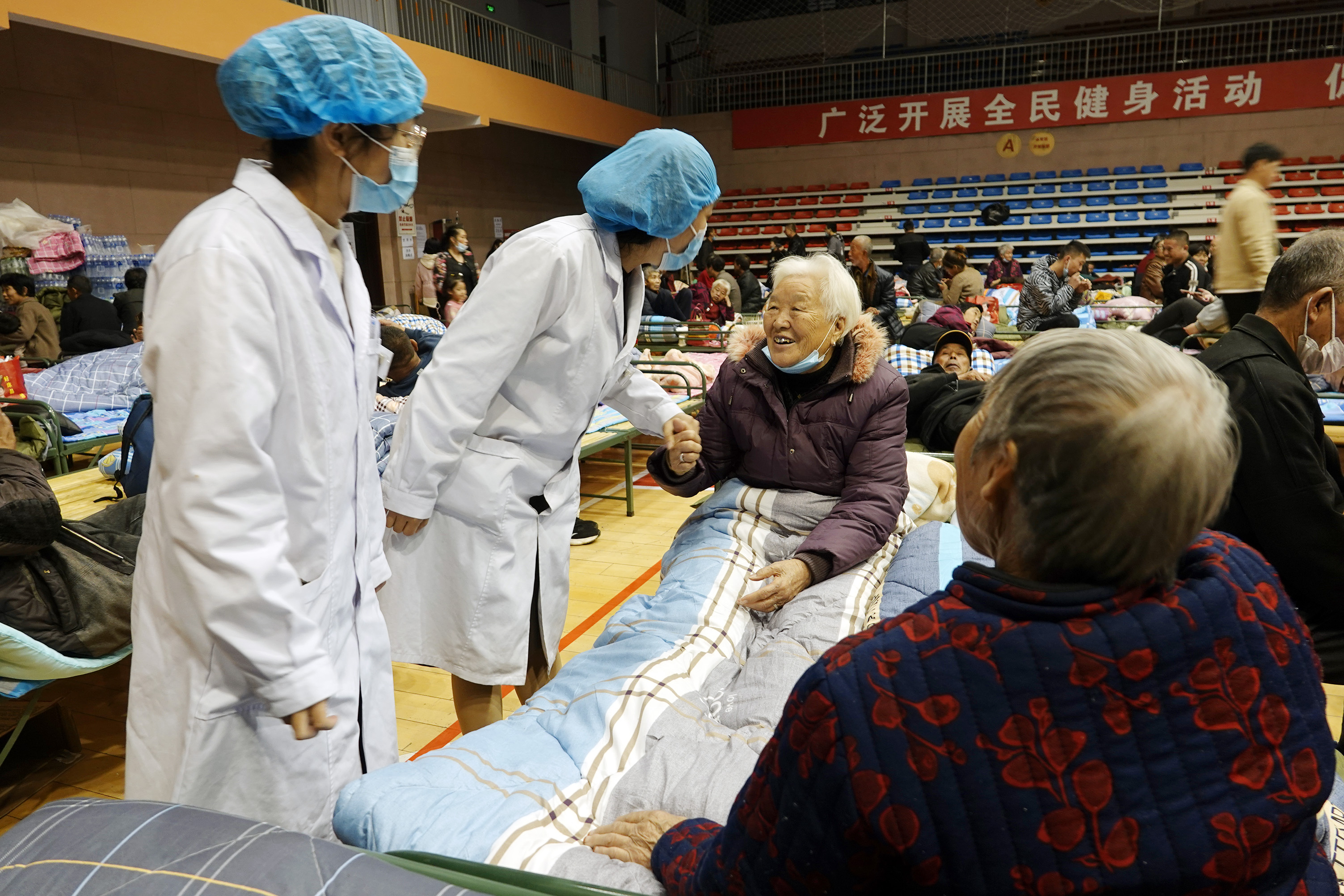 10月8日,在運城市新絳縣體育館安置點,兩名值守醫護人員(左)了解洪峰受災群眾身體健康情況。高新生攝