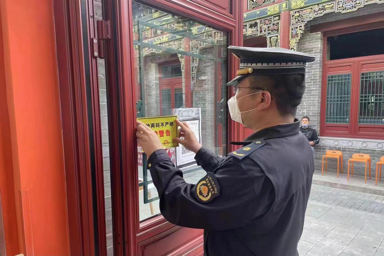 5月23日,迎澤街道綜合執法隊接到網格員預警,有商戶未落實疫情防控“四要素”,執法隊員第一時間到達現場,依法依規開展工作。趙崢 攝