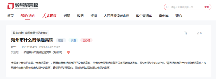 人民網太原4月8日電(田小麗)“細致專業!”近日,山西朔州市民張先生在“領導留言板”寫下滿意評價,“我在留言板咨詢了朔州市區何時通高鐵的問題,沒想到很快就接到了相關部門的電話,得到明確時間?!?/p>