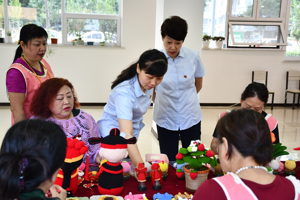 “老師,我這個花紋的針法鉤對了嗎?”“我這個怎么打不了結?是不是數漏針了?”手工鉤織老師正在給社區居民上課,現場二三十名學員相互切磋,非常熱鬧。