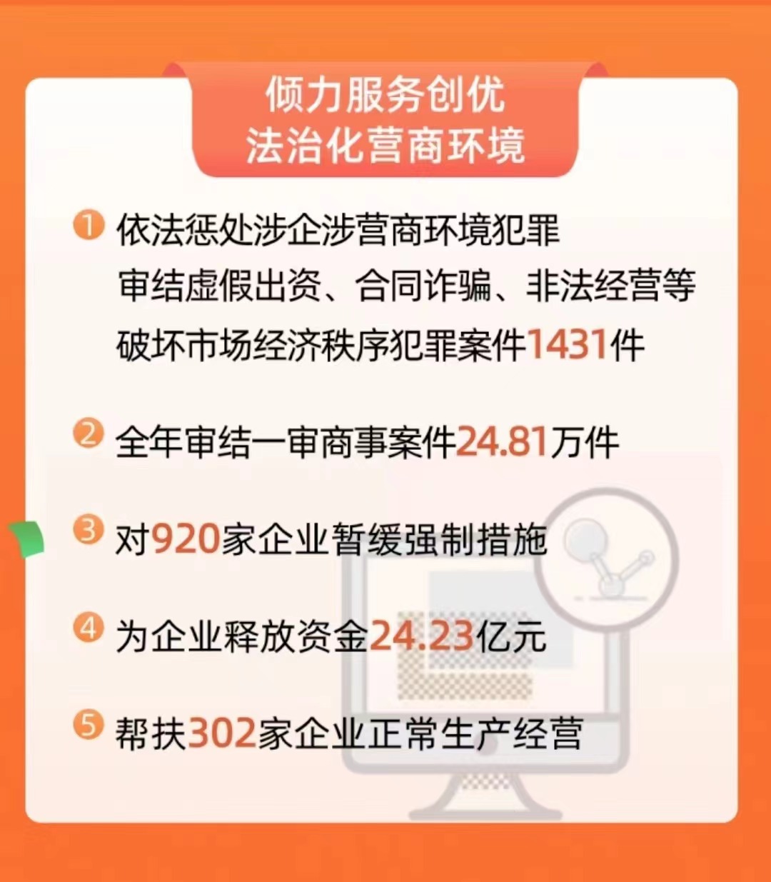 過去一年,山西法院著力為企業發展紓困解難,運用執行和解、“放水養魚”等柔性執行方式,對920家企業暫緩使用強制措施,為企業釋放資金24.23億元、土地926.84畝、廠房4.92萬平方米,幫扶302家企業正常生產經營。