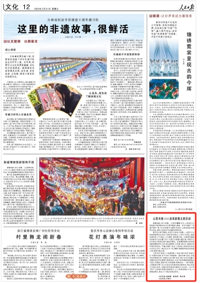 本報太原2月20日電 (記者馬睿姍)近日,山西省文化和旅游廳指導聯動各市開展“錦繡太原城 歡樂中國年”“平遙中國年”等1500余項春節主題系列活動,讓游客體驗非遺年俗活動,感受山西的歷史底蘊和濃厚年味。