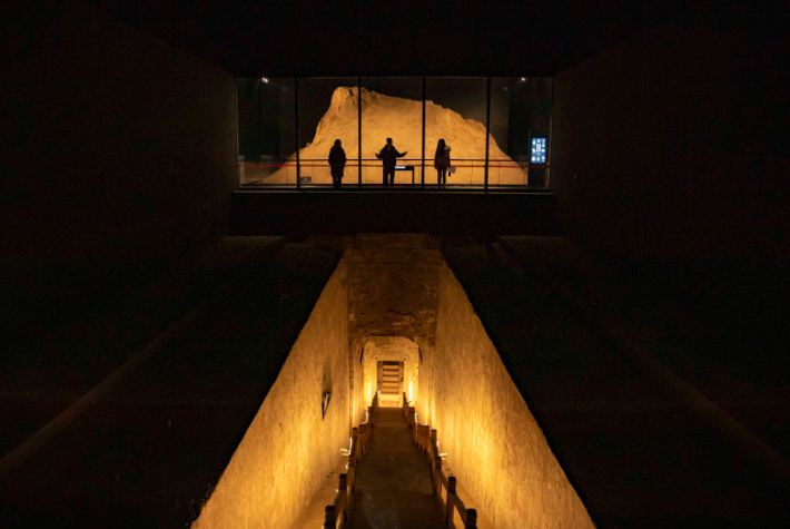 在遺址廳,透過玻璃,徐顯秀墓墓道、過洞、甬道,清晰可見。人民網記者 王帆攝