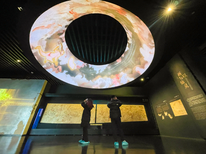 整個展館3800余平方米,分為壁畫廳、遺址廳、臨展廳3個空間。博物館結合壁畫原件、數字化展項、互動游戲等多種展陳手段,運用3D、AR、VR等數字技術,打造了多個沉浸式體驗場景,營造“人在畫中游”的奇妙之旅。