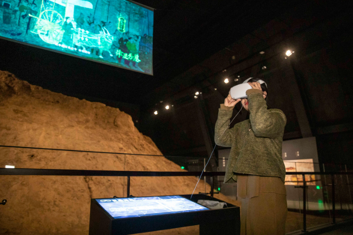 遺址廳是博物館重頭戲。透過玻璃,墓道、過洞、甬道清晰可見。站在墓葬封土堆旁,戴上4K分辨率的VR眼鏡,只見威武的儀仗分列兩邊,樂伎奏響激昂胡樂,徐顯秀夫婦身著華服舉杯宴飲,氣氛熱烈。置身其間,北齊生活仿佛可觸可感。