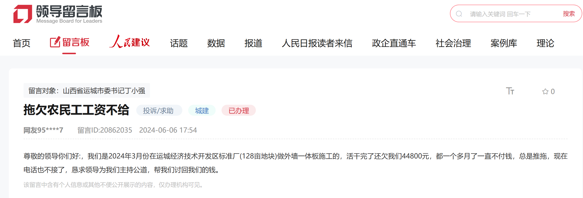 6月7日,王先生通過人民網“領導留言板”給運城市委書記留言,反映他于今年3月份在運城經濟技術開發區標準廠做外墻一體板施工,活干完了仍有44800元工資被拖欠?!盎顑菏莾蓚€人干的,對方一直拖著不付錢,后來電話也不接了?!蓖跸壬榧敝铝袅搜?。