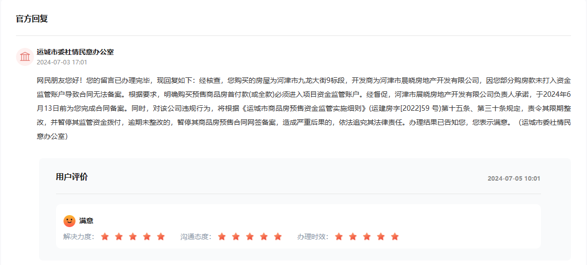 經查,網民反映情況屬實,河津市住建局隨即督促開發商——河津市晨曉房地產開發有限公司將網民繳納的購房款退還給網民,并由網民繳納至該公司資金監管賬戶。6月21日,網民的購房合同完成備案。