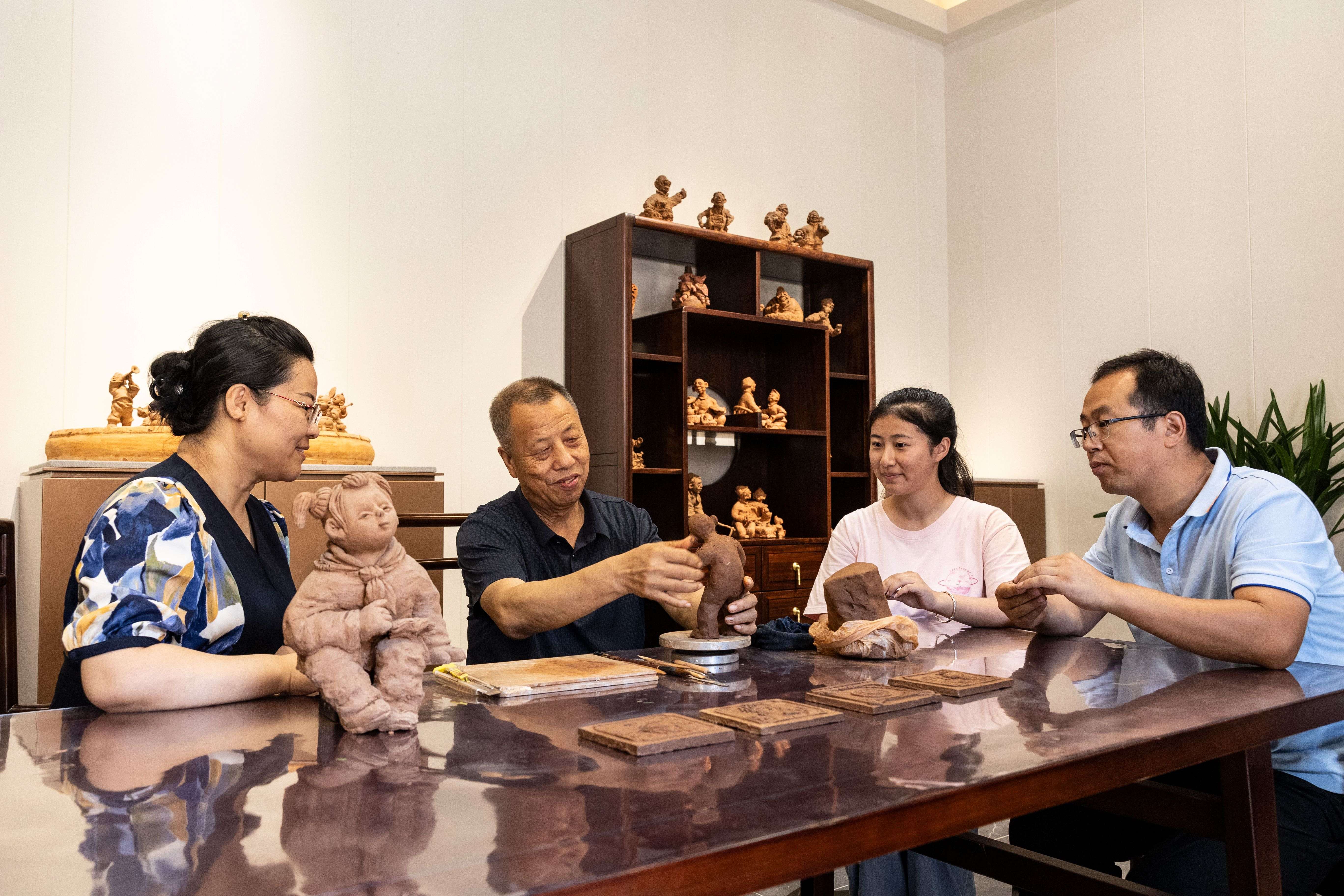 走進釜山村的棋盤六院里,高大兩層古建質樸自然,門楣上的木雕繁復美觀。院子里一間泥塑工坊內,非遺傳承人史月明正在創作。