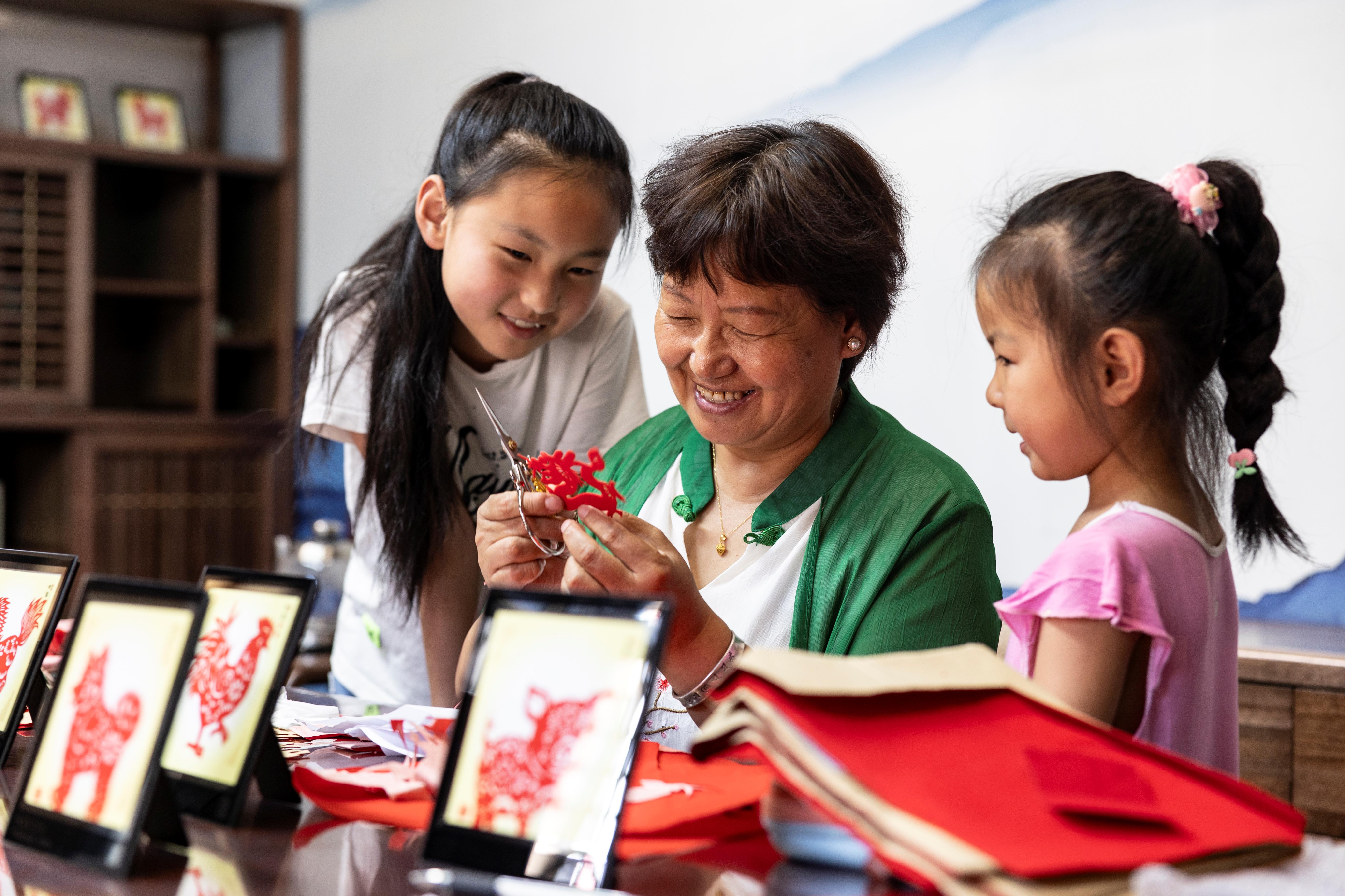 高平市釜山村,高平剪紙非遺傳承人趙玉先在教授外孫女剪紙技藝。王劍 攝