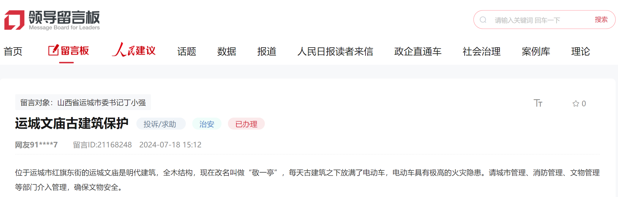 近日,市民楊先生發現,當地市級文物保護單位、明代建筑運城文廟敬一亭周圍有不少電動車亂停亂放,存在火災隱患,于是在人民網“領導留言板”留了言:“運城文廟敬一亭是全木結構,周圍每天放滿了電動車。請有關部門介入管理,確保文物安全?!?/p>