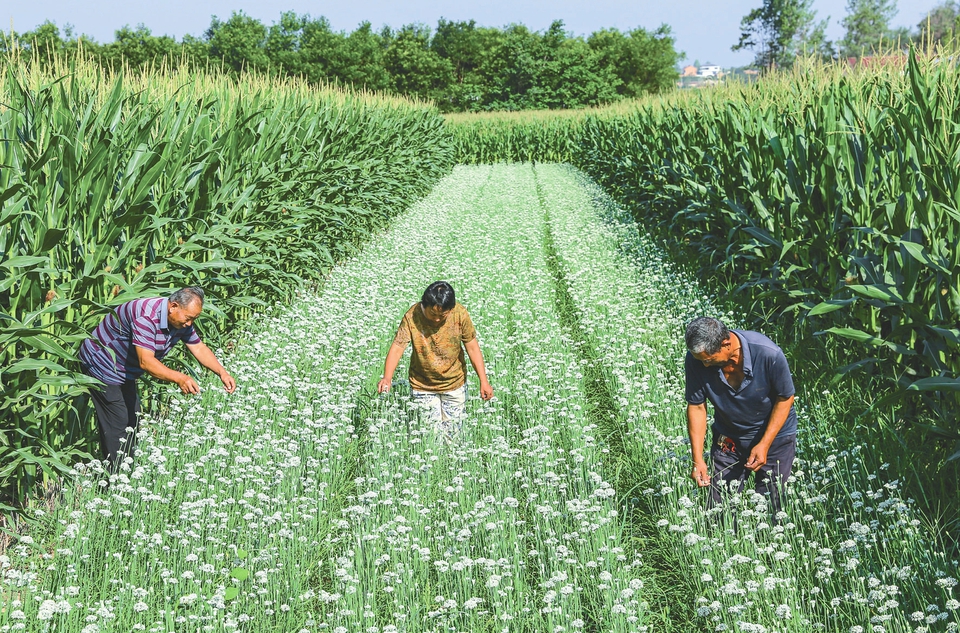 8月19日,夏縣胡張鄉永窯村種植的500畝韭菜花陸續盛開,菜農趁著晴好天氣加緊采摘供應市場,田間地頭一派繁忙景象。(張秀峰 攝)