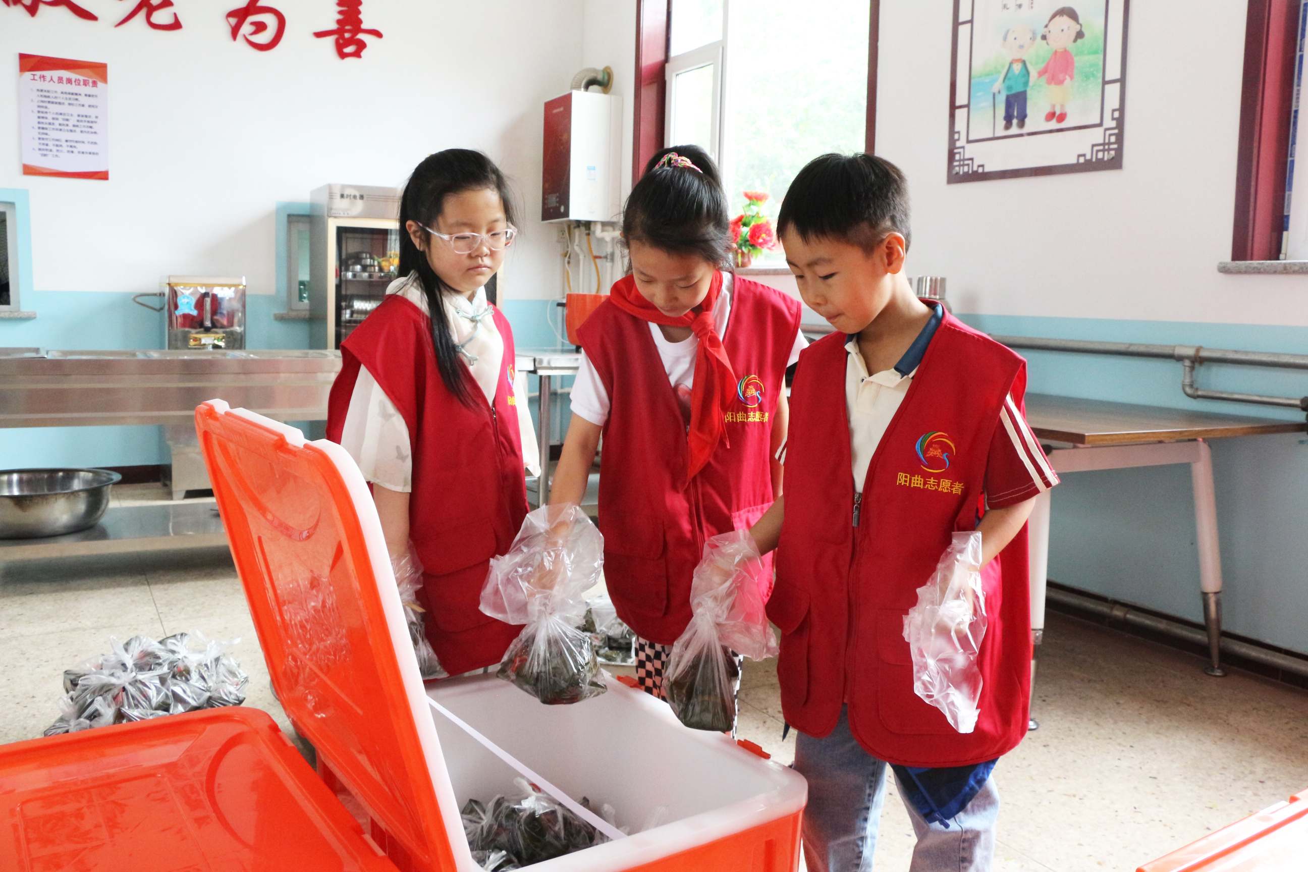 村里的小學生志愿者走進“孝心食堂”幫助工作人員送餐。錄古咀村供圖