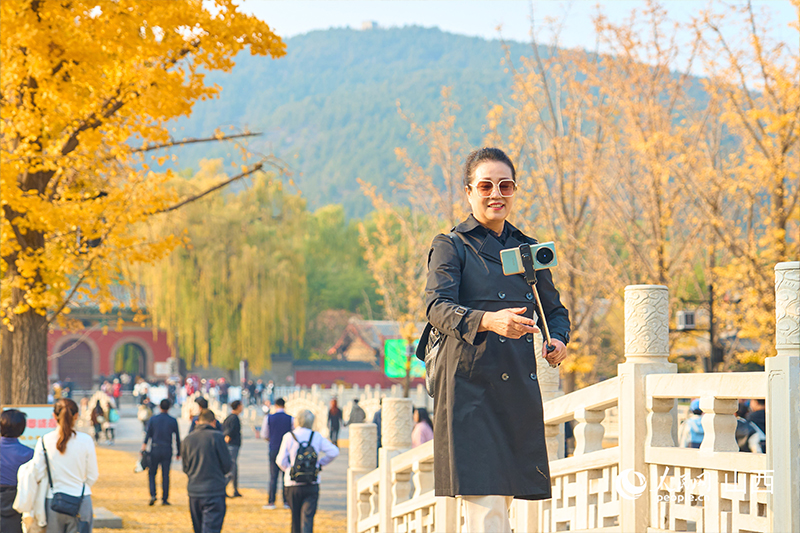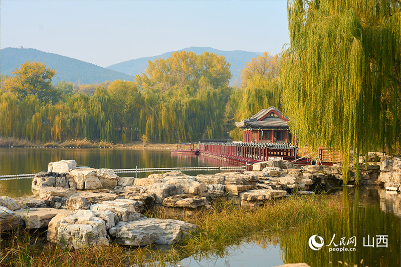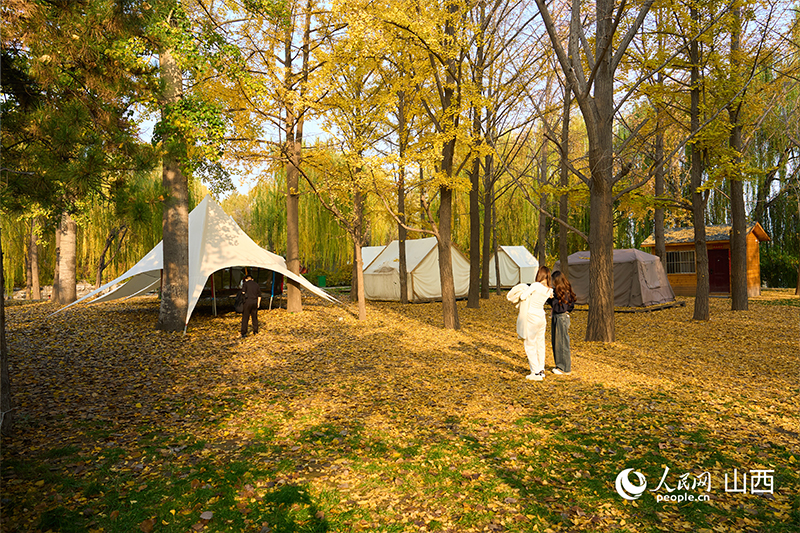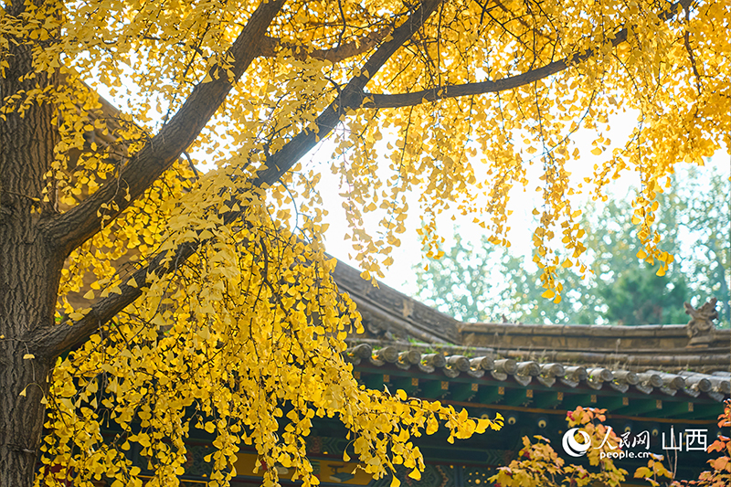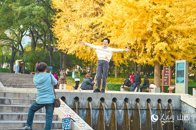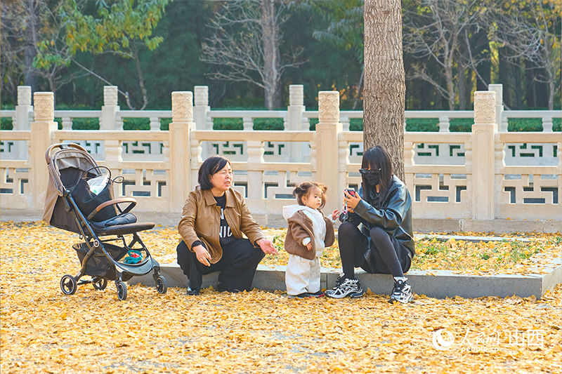 11月8日,晉祠公園內銀杏葉已換上金裝,陽光透過樹梢,斑駁陸離的光影與銀杏葉、古建筑共同交織成一幅動人的初冬畫卷。公園內游人如織,歡聲笑語不斷。