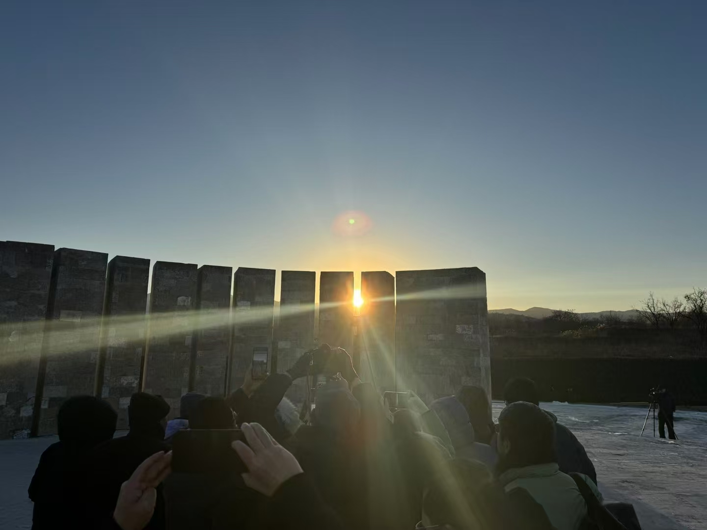 12月21日,一大早,襄汾縣居民齊聚觀象臺,觀看陽光從右側第二個縫隙射出。