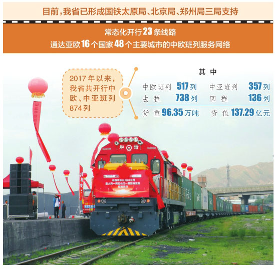 2月26日,陽泉至烏茲別克斯坦塔什干的中亞班列以及白俄羅斯明斯克至陽泉的中歐班列順利開通,填補了國鐵北京局集團管內山西中歐班列開行的空白;3月28日,太原市皇后園至俄羅斯莫斯科的中歐班列開行,實現了太原市中歐班列開行零的突破;4月26日,我省到西班牙巴塞羅那的首列中歐班列順利抵達;6月26日,首發大同經阿拉山口至莫斯科的中歐班列;8月30日,革命老區呂梁至莫斯科的中歐班列在文水首發;12月6日,聯合長治市政府、國鐵鄭州局集團舉行了由長治北經阿拉山口至莫斯科的首發儀式。