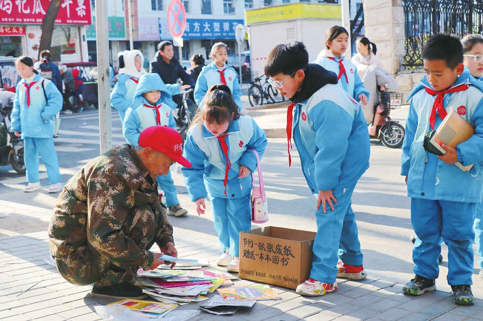 2024年12月5日,正值國際志愿者日,環保志愿者劉保正在長治街頭用嶄新的文具換取學生們的廢舊書本,旨在讓學生們認識到環保的重要性。近年來,環保意識在全社會如春風化雨般滲透,“綠色發展、低碳生活”的理念逐漸深入人心。楊晨玉 攝