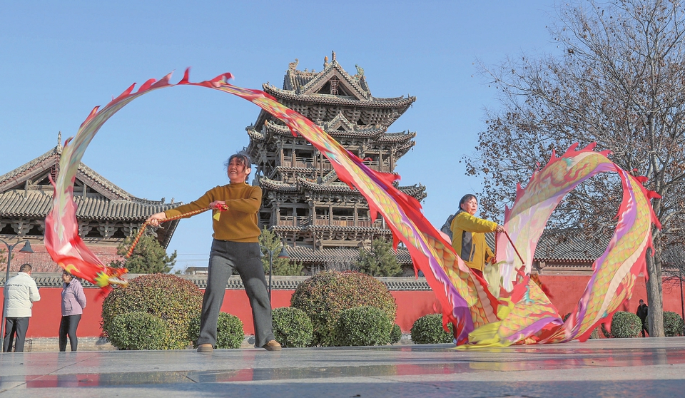2月4日,在萬榮縣飛云樓下的小廣場,幾名健身舞龍愛好者一展風采。來自全國各地的游人與當地群眾一道,在盡情欣賞飛云樓等景點的同時,共享多彩舞龍鬧新春的歡樂。(李克榮 攝)