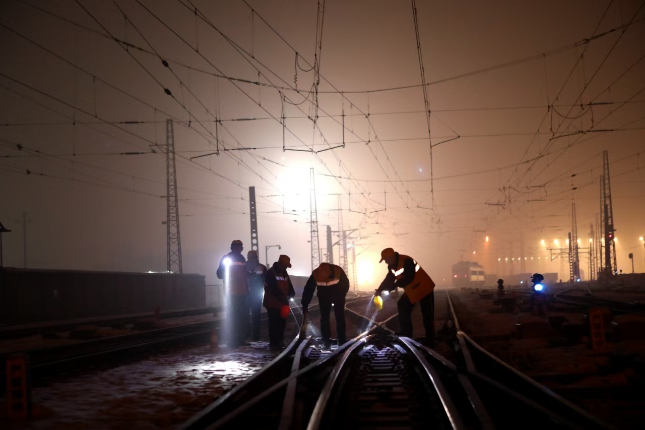 車站鐵路線上,寒風凜冽,列車不時鳴笛穿行,工作人員通過對講機實時對接工作,整個車站看起來忙碌而有序。