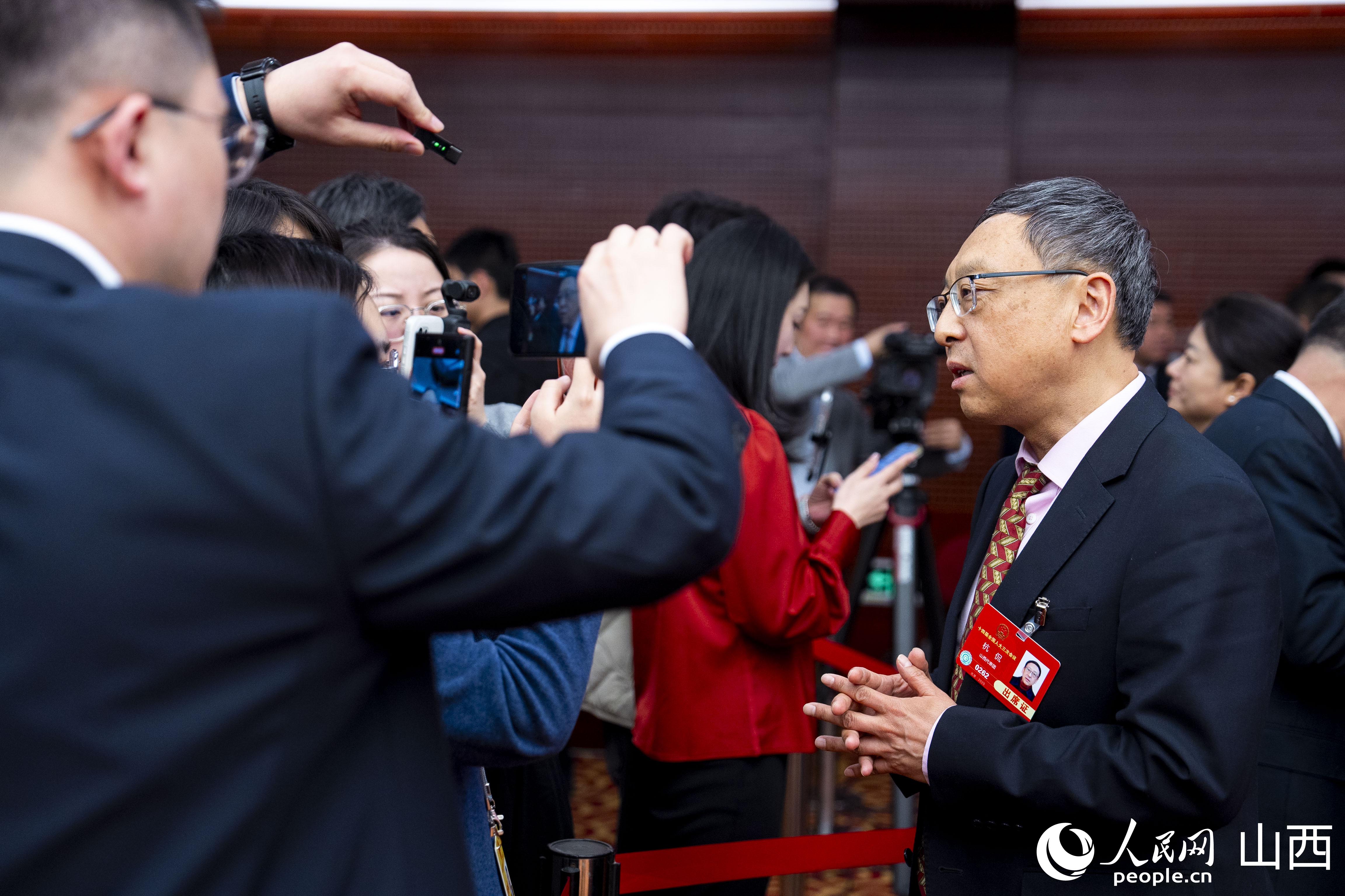 全國人大代表、云岡研究院院長杭侃接受媒體記者采訪。人民網 盧鵬宇攝