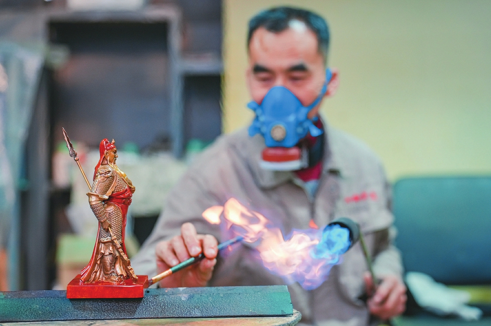 近日,山西宇達青銅文化藝術股份有限公司生產車間內,工人正在加工關公銅像模型。近年來,該公司持續加大創新力度,采用新材料、新技術、新工藝,生產的產品出口到23個國家和地區。(陳方斌攝)