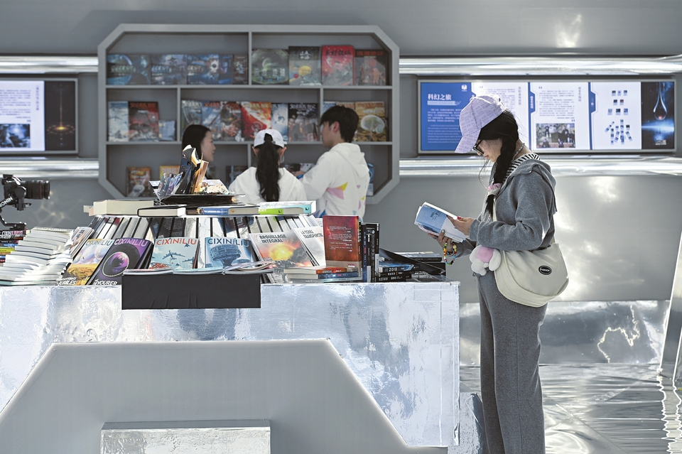 4月23日,走進山西省科學技術館二層公共空間,一座極具未來感、形如宇宙空間站的展廳映入眼簾。這里便是第四屆全民閱讀大會·劉慈欣科幻文學展的展廳。該展廳通過巧妙的空間布局、燈光設計和裝飾細節,令觀眾仿佛置身于浩瀚的宇宙之中。200余冊劉慈欣的科幻作品及多語種譯本錯落擺放在“空間站”各處,等待著與觀眾共赴一場沉浸式科幻之旅。