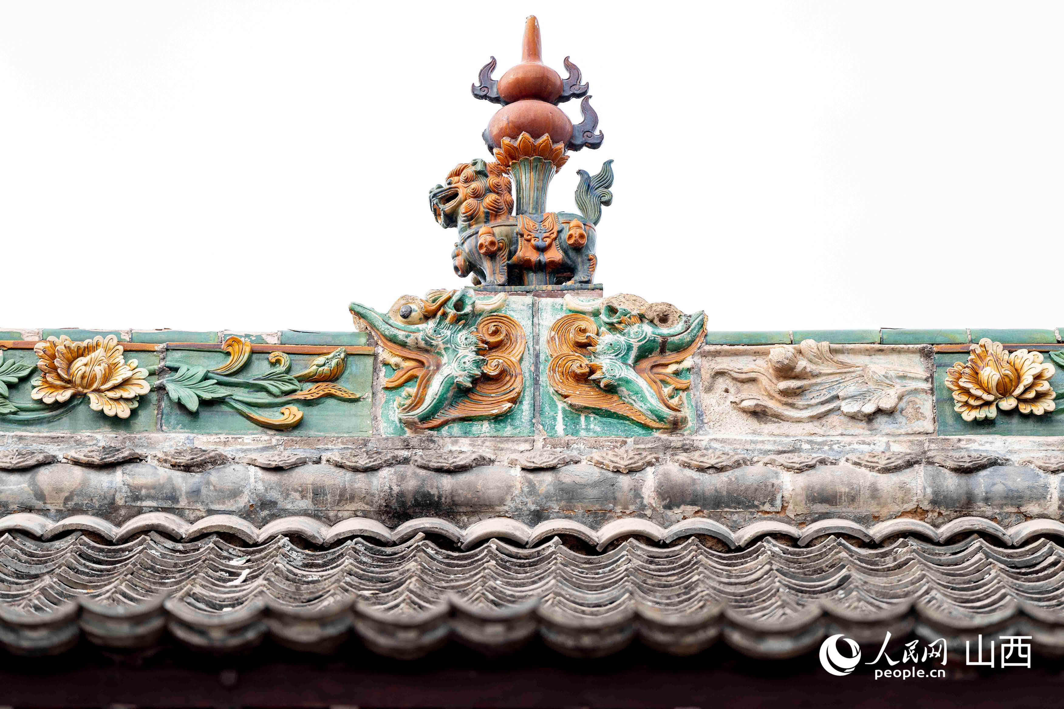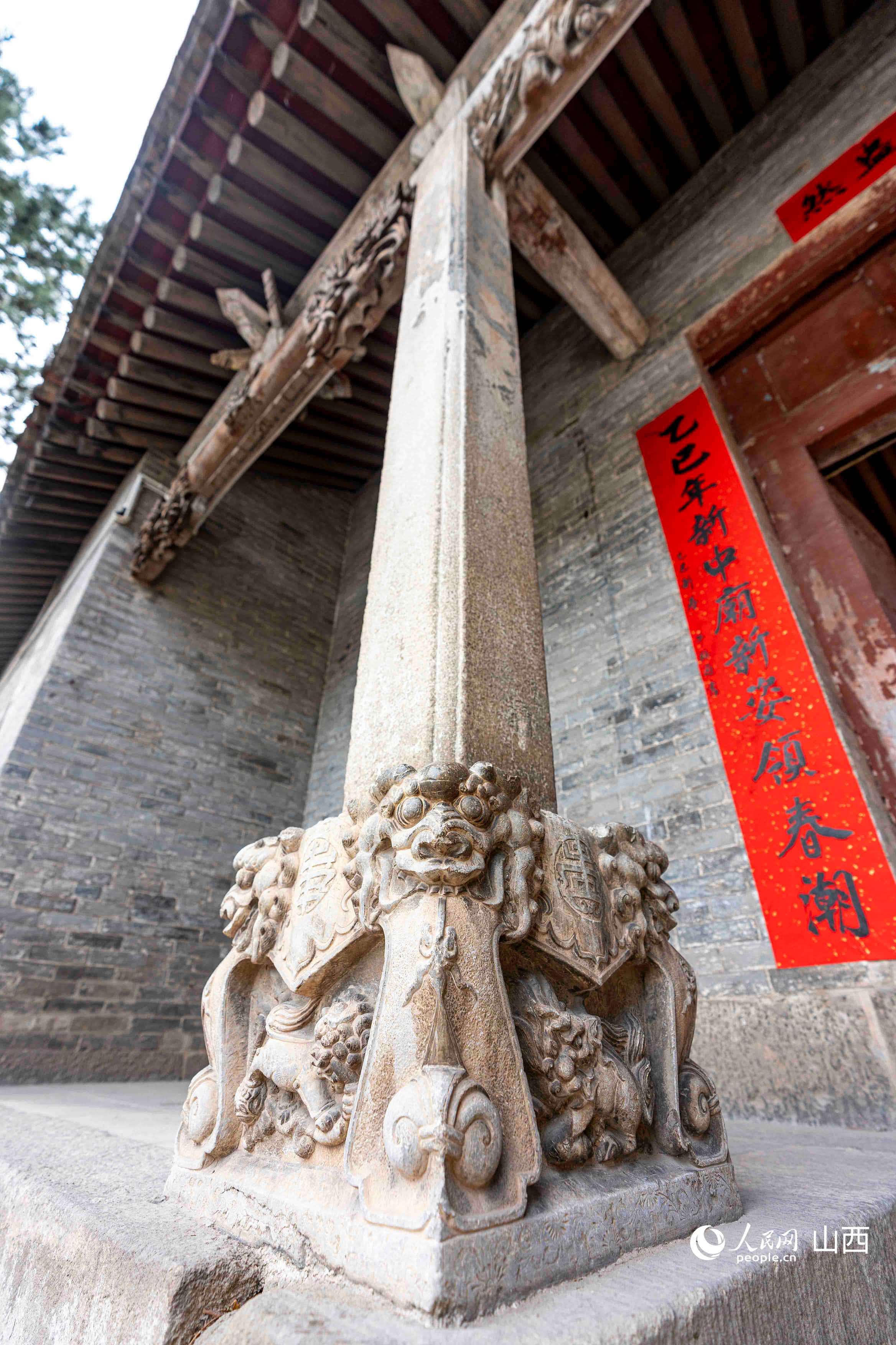 移步近觀,前檐石柱底部四面浮雕瑞獸與威嚴獸首,明代獅頭柱礎四角為獅頭咬幾腿,幾腿內雕刻獅子滾繡球造型,暗合“鎮守廟門”的營造寓意,經500年風雨仍清晰可辨。仰首可見懸山頂兩側的垂脊瓦作,滴水檐端“福壽”字樣瓦當與明代原構琉璃脊筒相映,將宋元遺風與明清規制熔鑄于同一時空坐標。