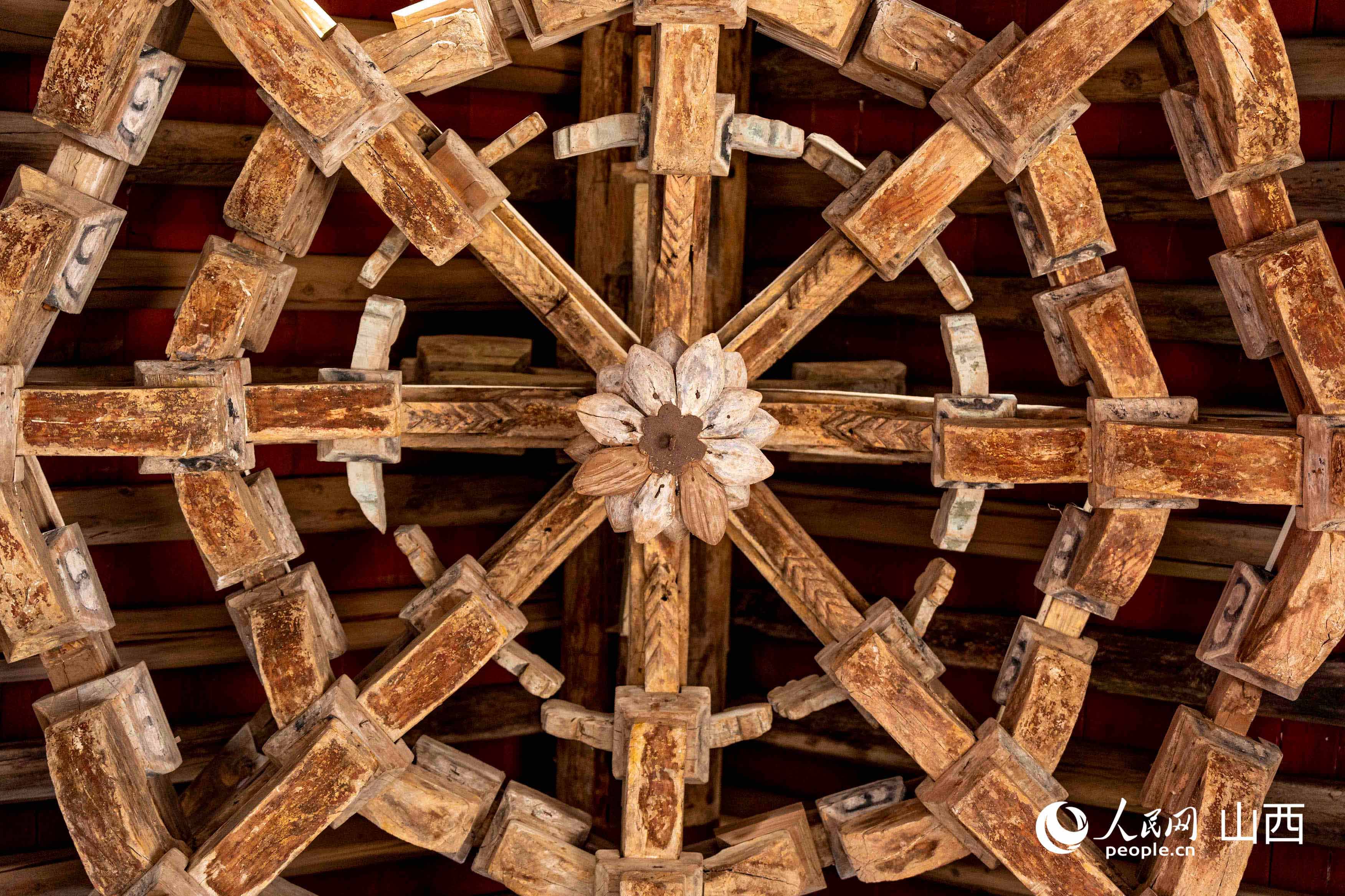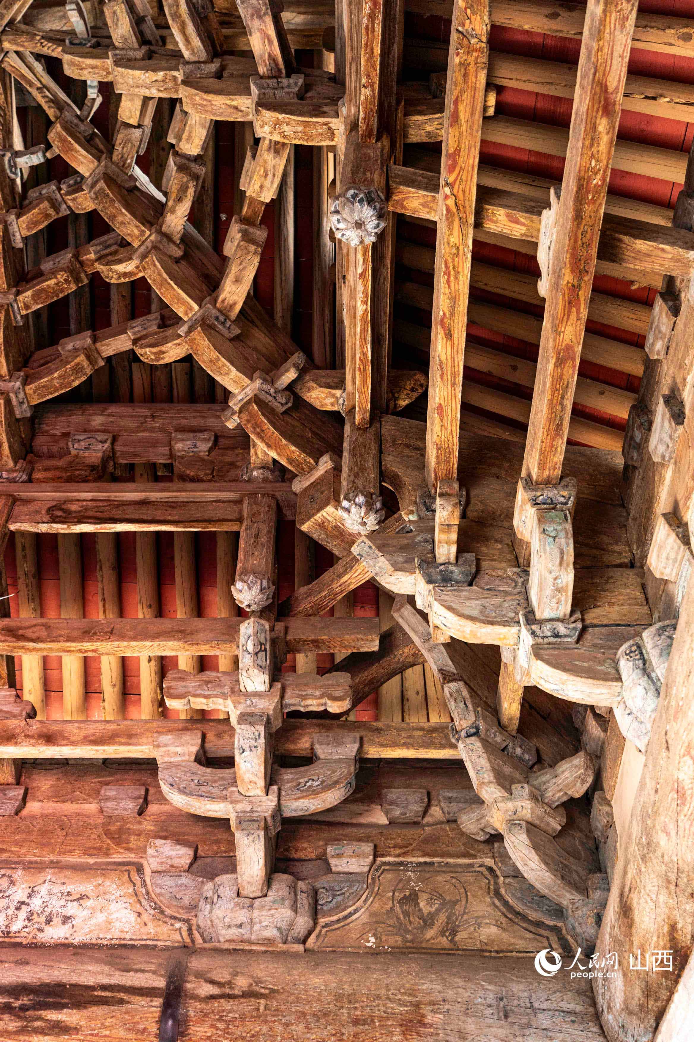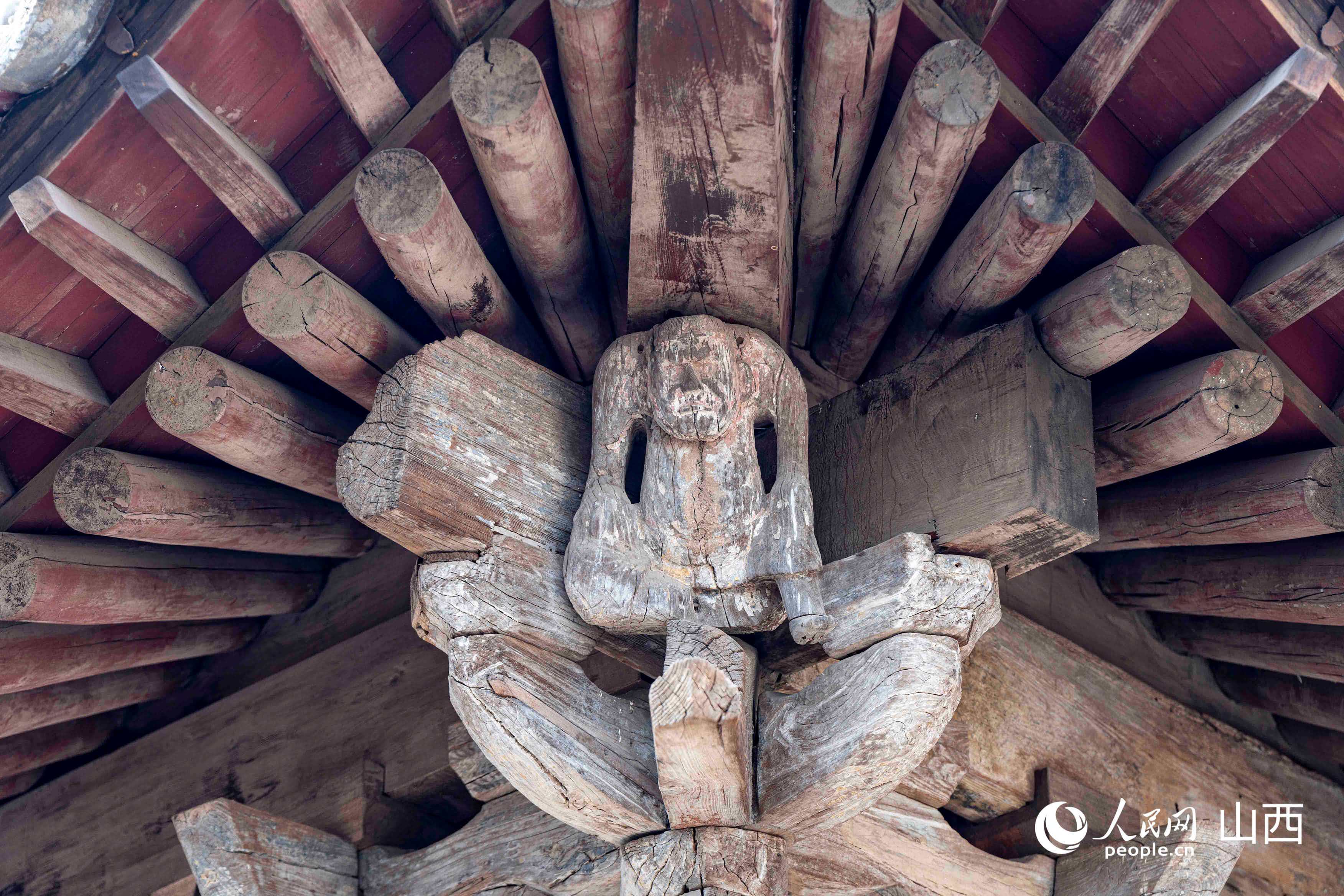 無梁殿是古中廟的核心建筑,也是全國唯一以元代木構入選全國重點文物保護單位的炎帝祭祀建筑。無梁殿最初功能實為戲臺,1.2米高的臺基抬升設計,使正殿神靈可“俯瞰”祭祀樂舞。轉角斗拱上的木雕角神構件,雖不承重卻暗含古人設角神以集千鈞之力支撐建筑,祈求堅固耐久的營造智慧。