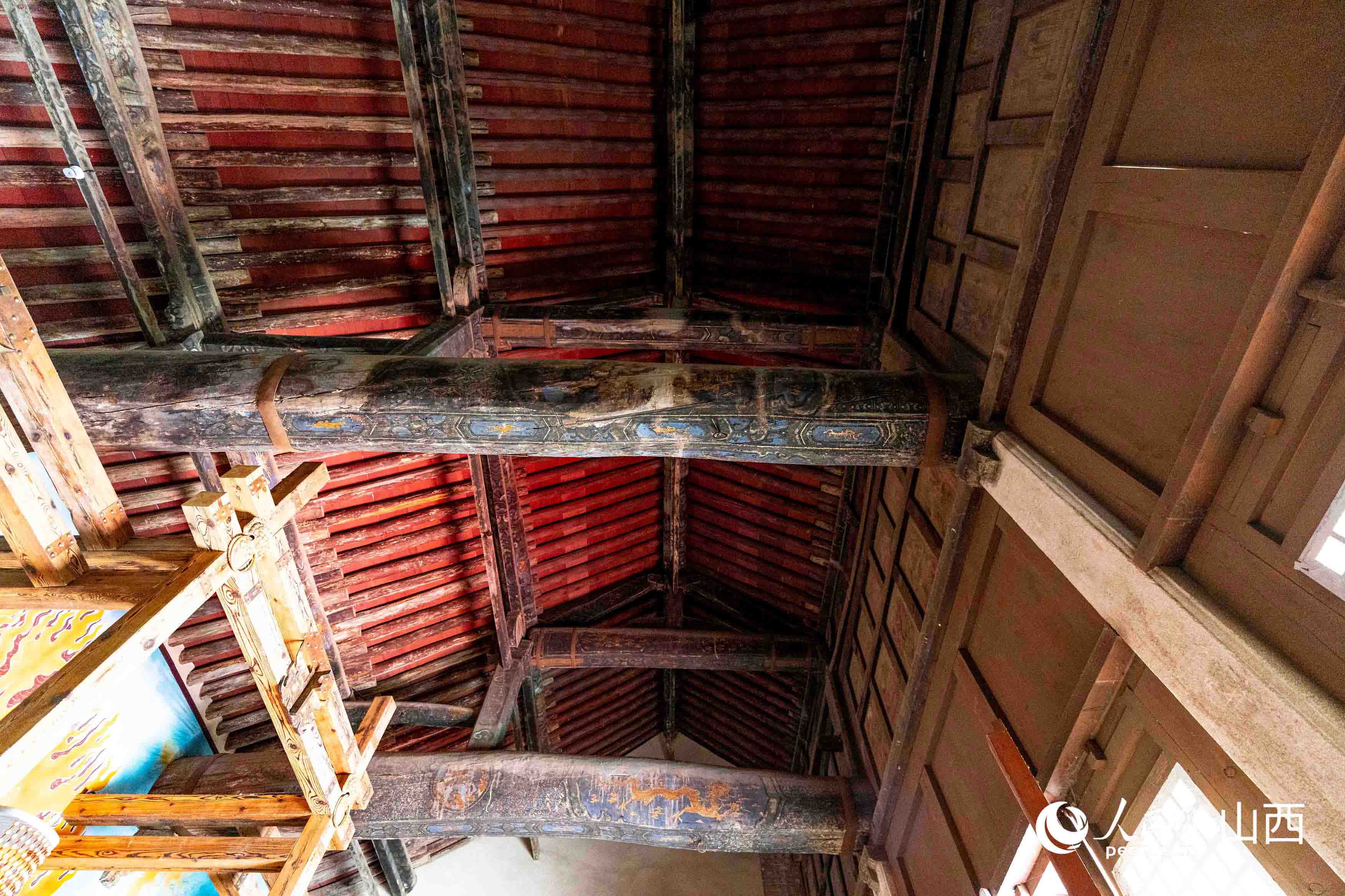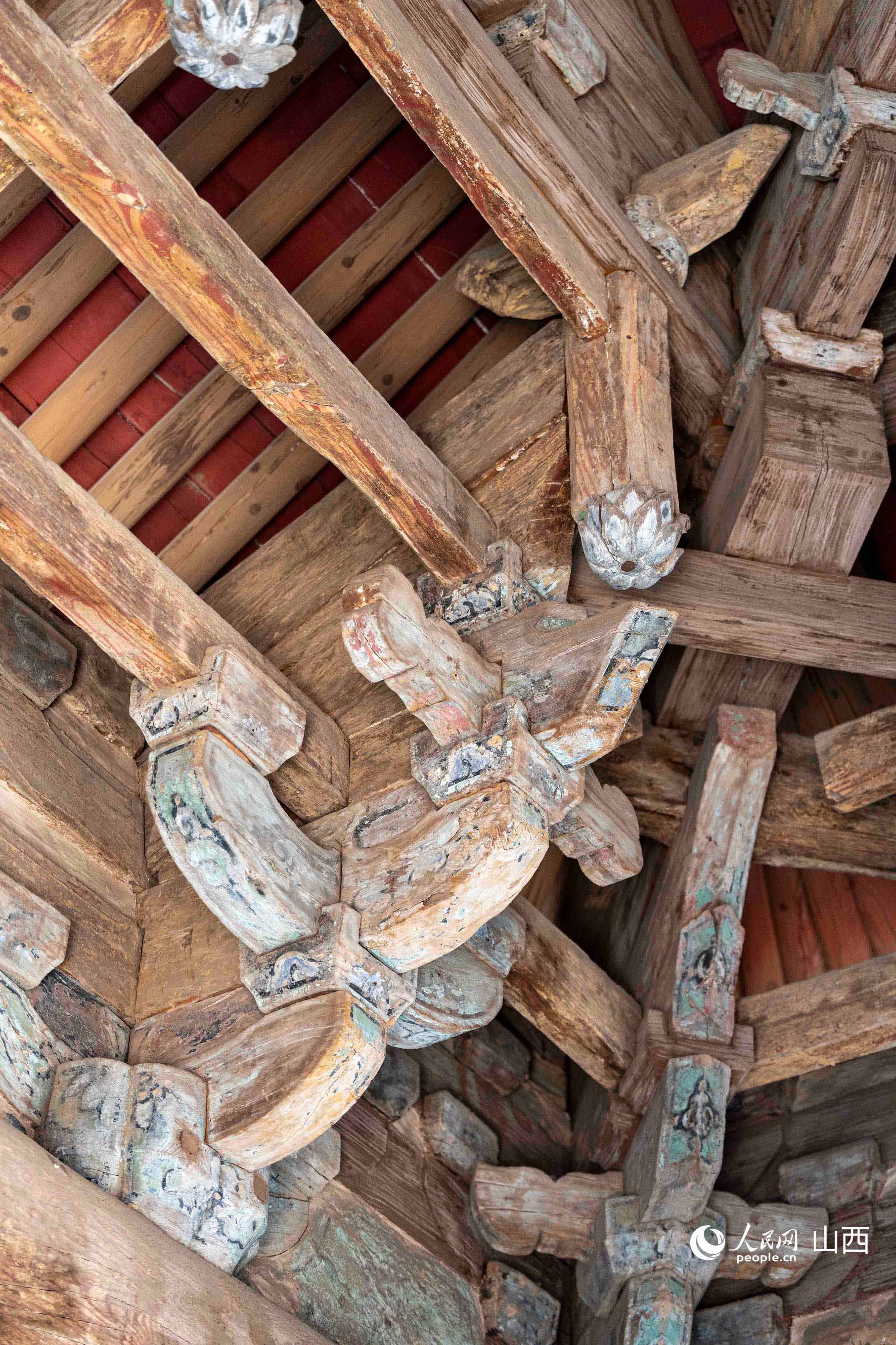 清康熙九年《重修炎帝廟碑》詳載“易梁換柱,施彩繪以彰神威”的修繕歷程。彩畫一詞可追溯自宋代《營造法式》,意為“施之于木構,彰之于五色”的工藝體系,既為“飾面之華”,亦為“護木之甲”?,F存梁架青綠為底、間施朱砂與石黃的彩畫,恰是彼時彩畫技法的實證。