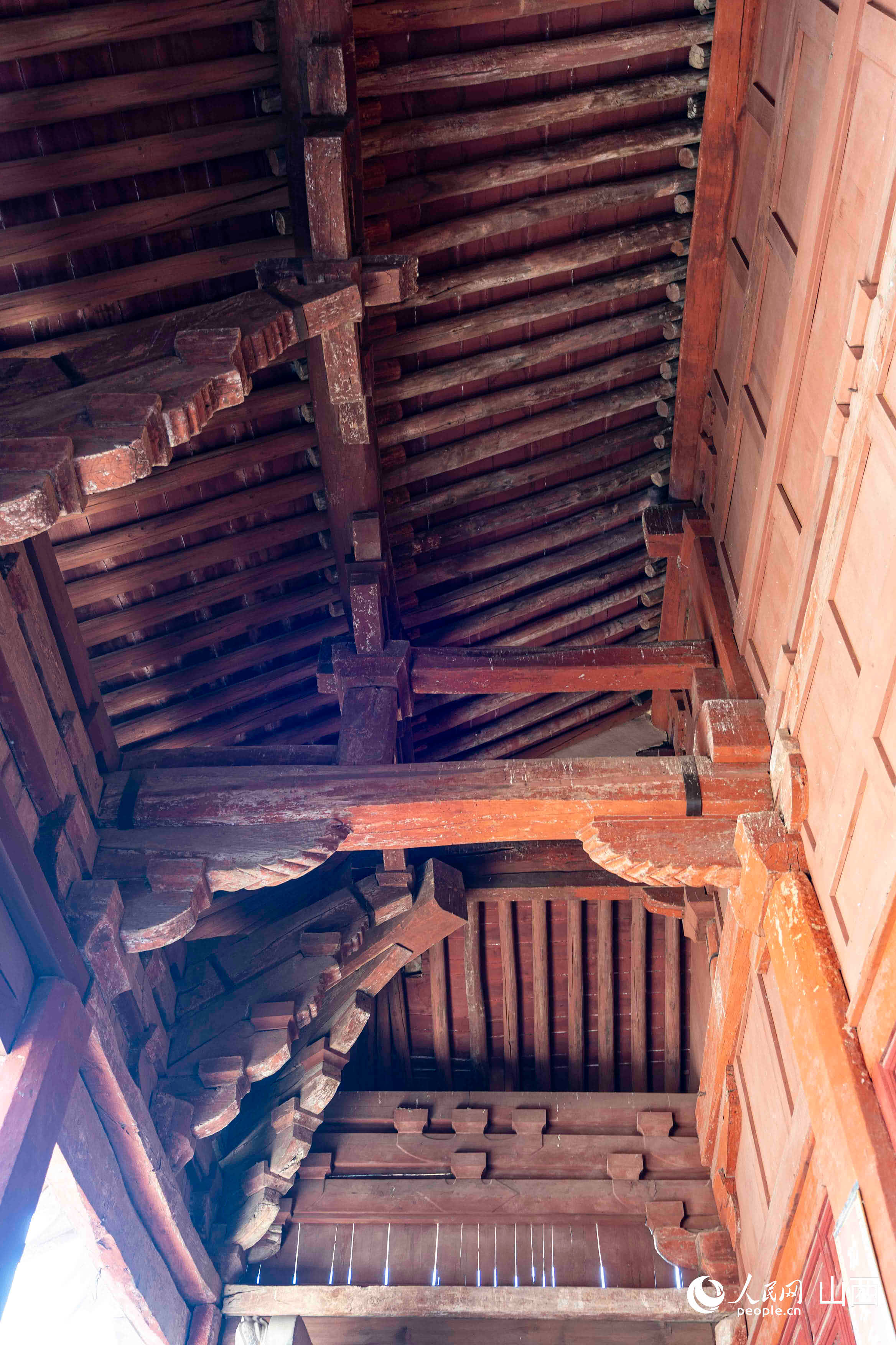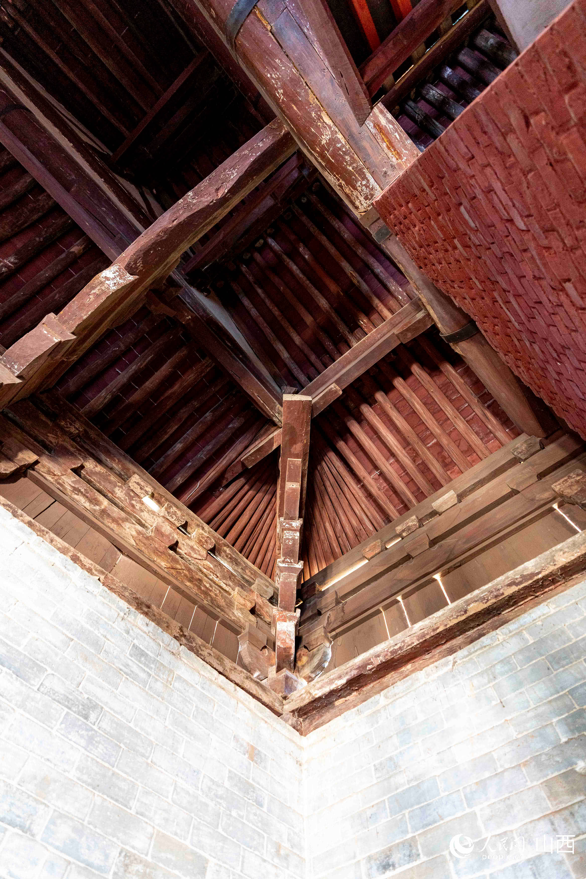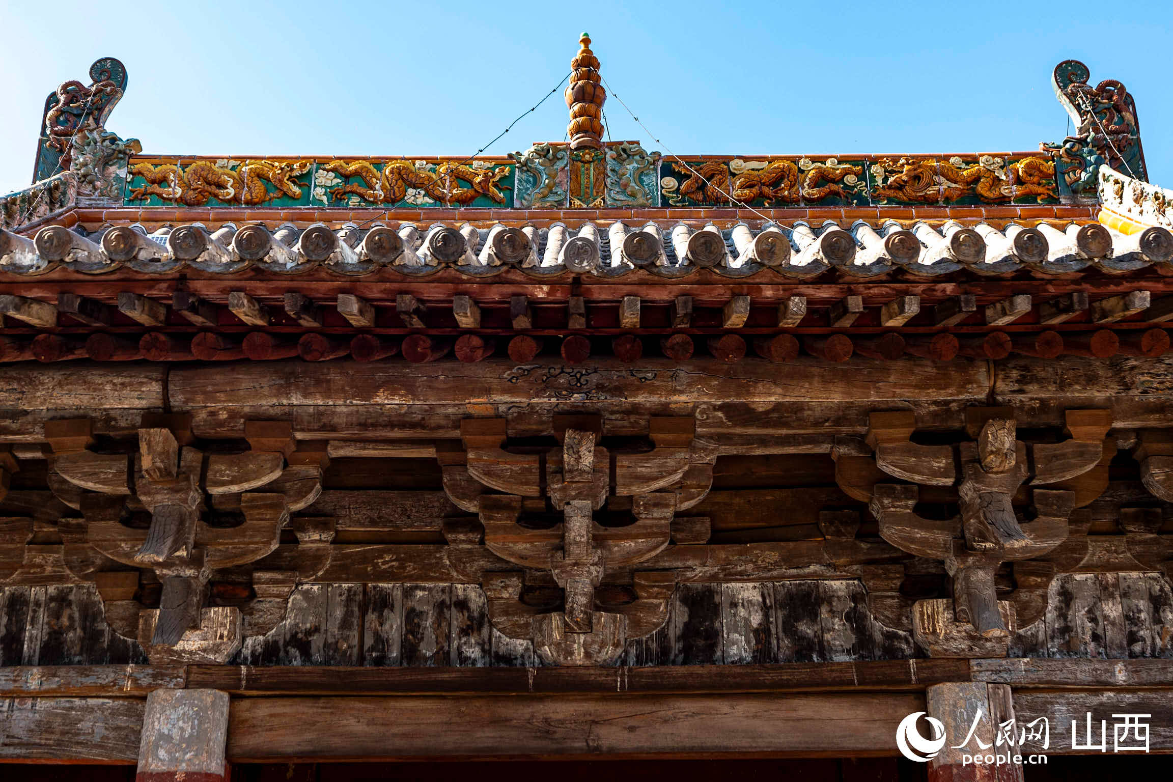拾級而上,山門之上的倒座戲樓豁然開朗。這個曾用油燈與火把照明的舞臺,其存在本身就是建筑智慧的結晶。尤為罕見的是山墻頂部的五疊式馬頭墻,這種源自徽派建筑的設計,不僅阻隔了明火隱患,更將戲臺與兩側妝樓的木構徹底隔離,見證了明清時期晉東南與贛皖地區的美學碰撞。