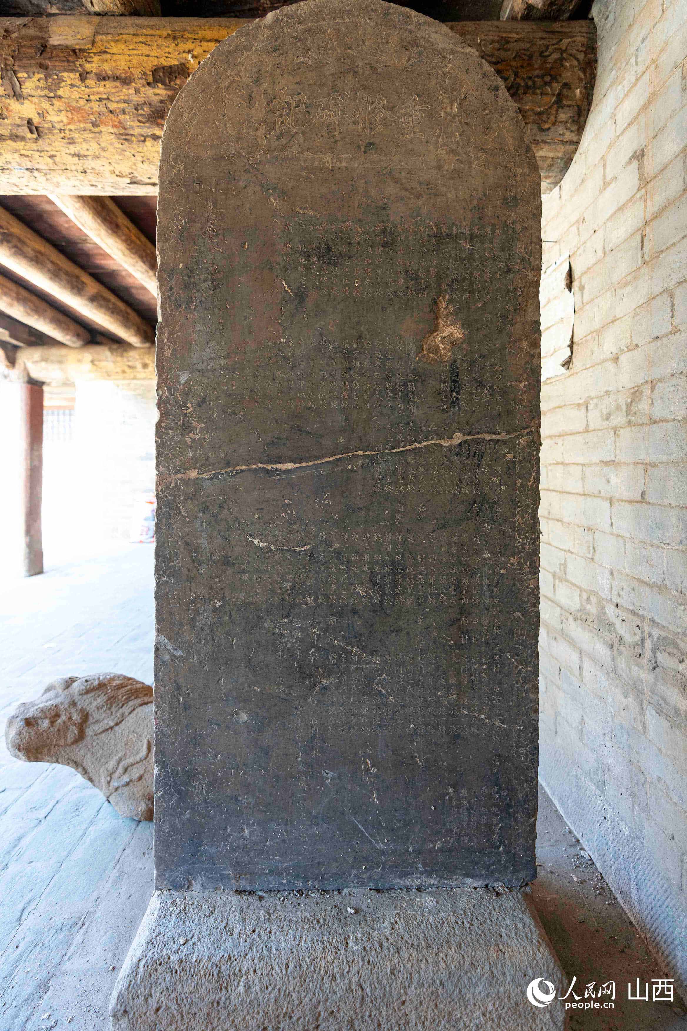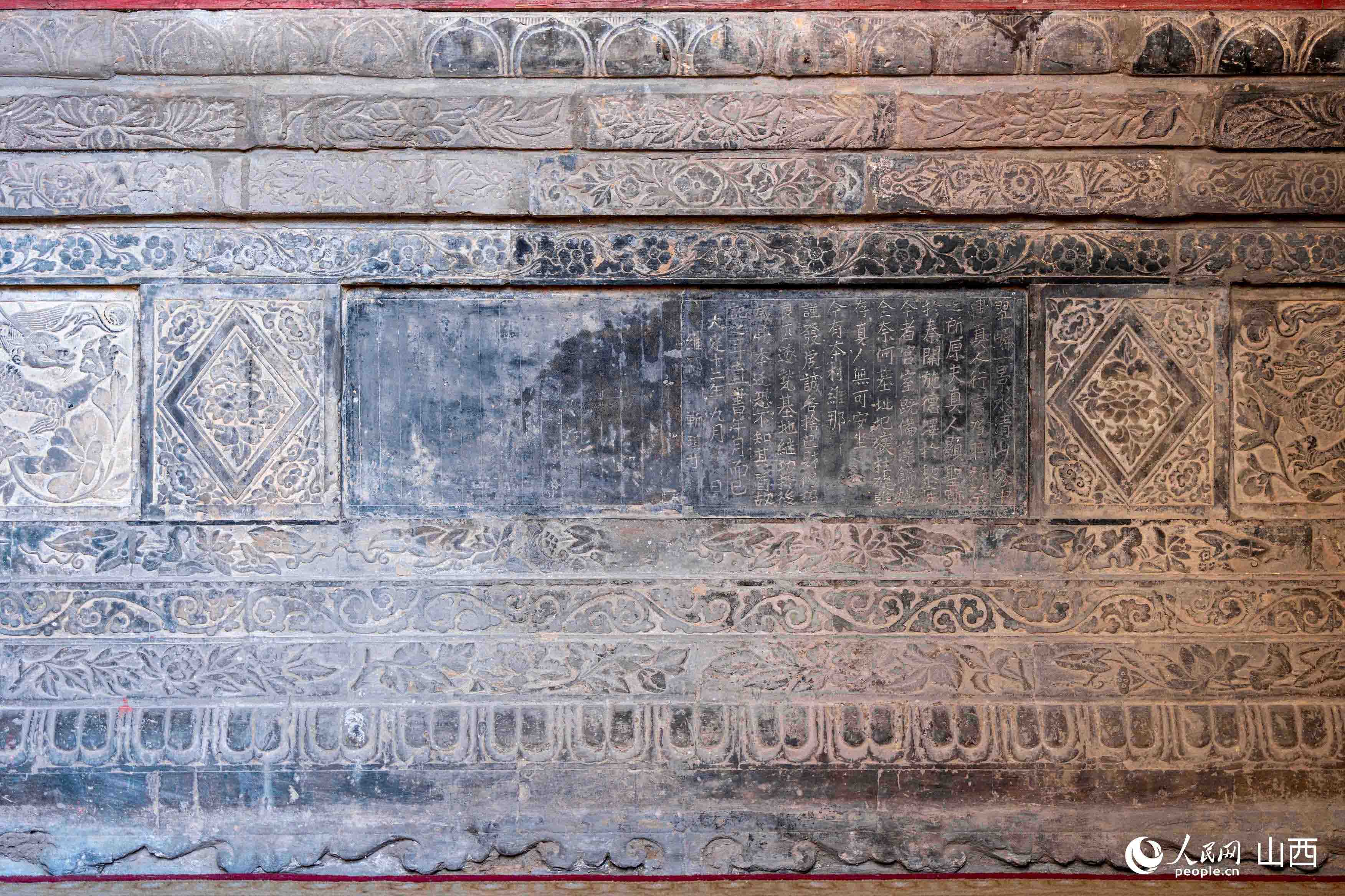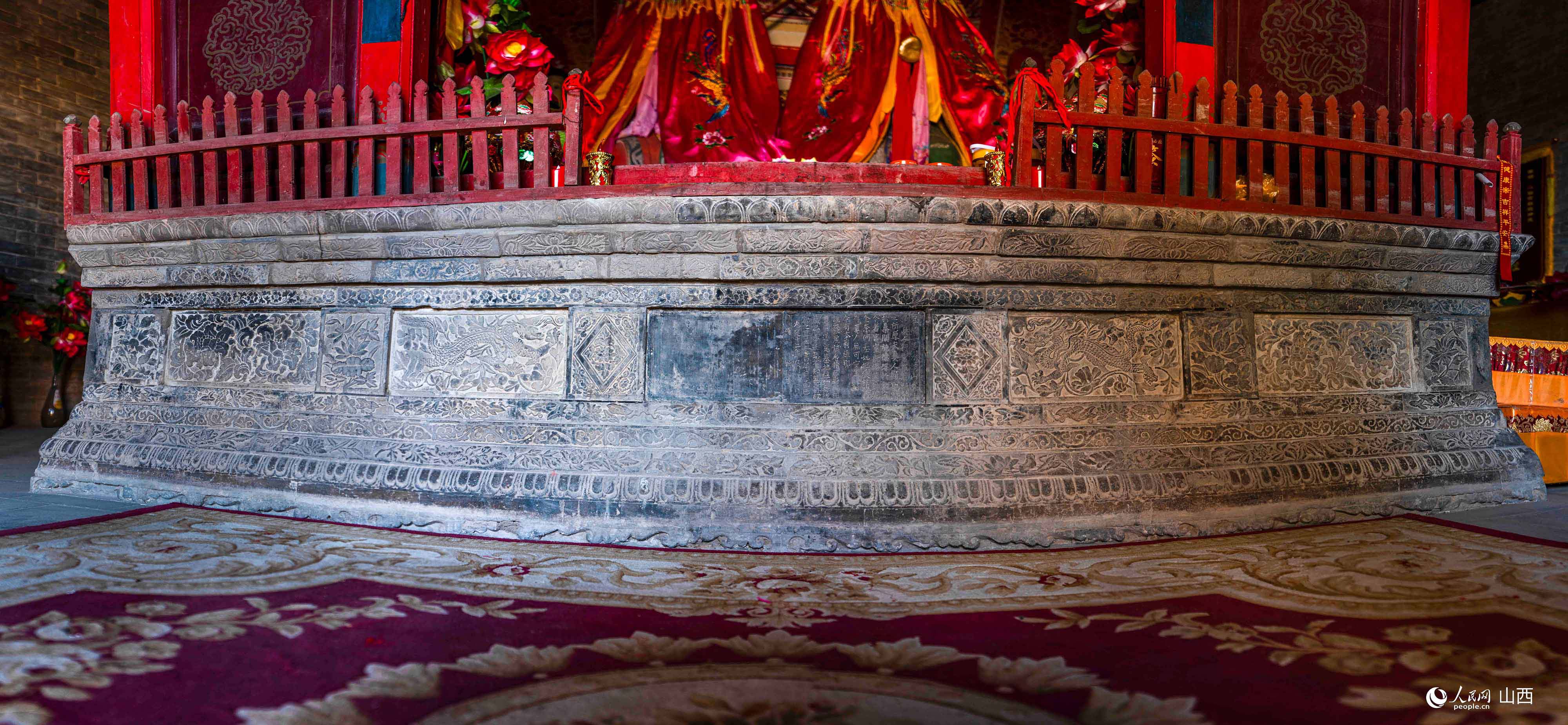 正殿中央現存青石雕須彌座式神臺,高約0.8米、邊長約3米,其形制與北宋《營造法式》“壘砌須彌坐殿階基”條目記載完全吻合。束腰處嵌飾牡丹、荷花、蓮瓣等浮雕圖案,中央鑲嵌金大定十二年重修題記碑。