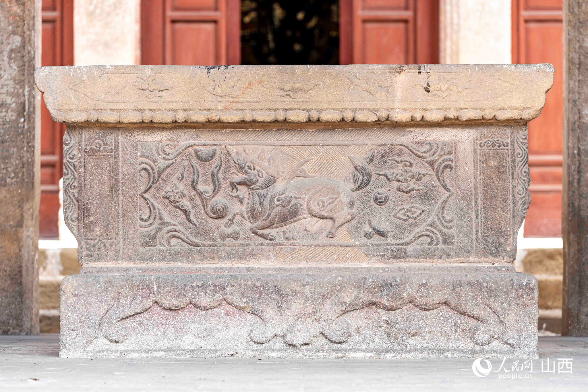 獻殿位于二郎廟中軸線核心區域,介于戲臺與正殿之間。其平面布局與正殿臺基相連,但低三級踏步,構建出遞進式空間序列。面闊三間,進深四椽,為明代遺構。殿內中央安置明萬歷九年(1591年)石雕供桌,桌面為砂石材質,而桌體和底座為少見的青石材質。前后束腰處雕刻纏枝牡丹、麒麟望月等吉祥紋樣,線條流暢且立體感強烈,兼具實用與儀式功能。