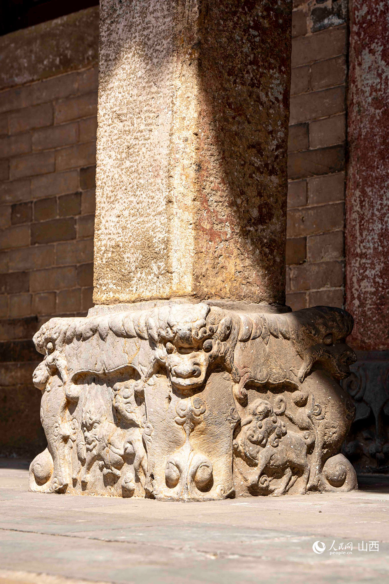 戲臺臺基高1.1米,上下均用條石包砌,呈簡單須彌座樣式。正面臺基束腰石刻有蓮花、牡丹與化生童子的圖案,兩側是石雕力士,中間被歲月磨圓的獅首石雕仍保持著凝望戲臺的姿態,仿佛仍在聆聽八百多年前的鼓樂之聲。