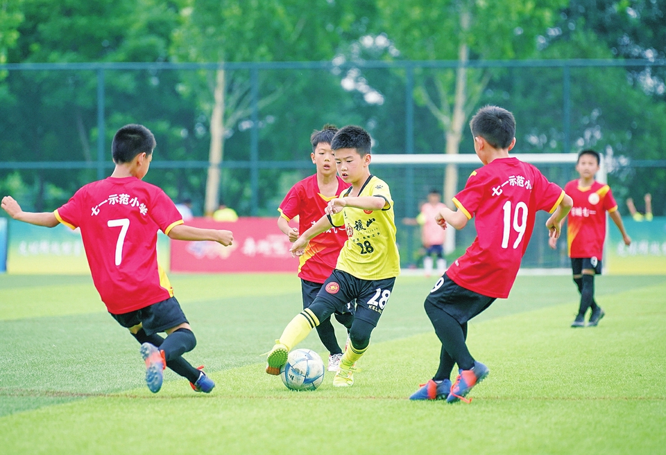 6月1日,在鹽湖區東郭運動公園,運城市第三屆青少年足球聯賽激戰正酣。本屆聯賽從5月開始,持續至10月結束,吸引當地200余支中小學足球隊、4000余人參賽。(閆鑫 攝)
