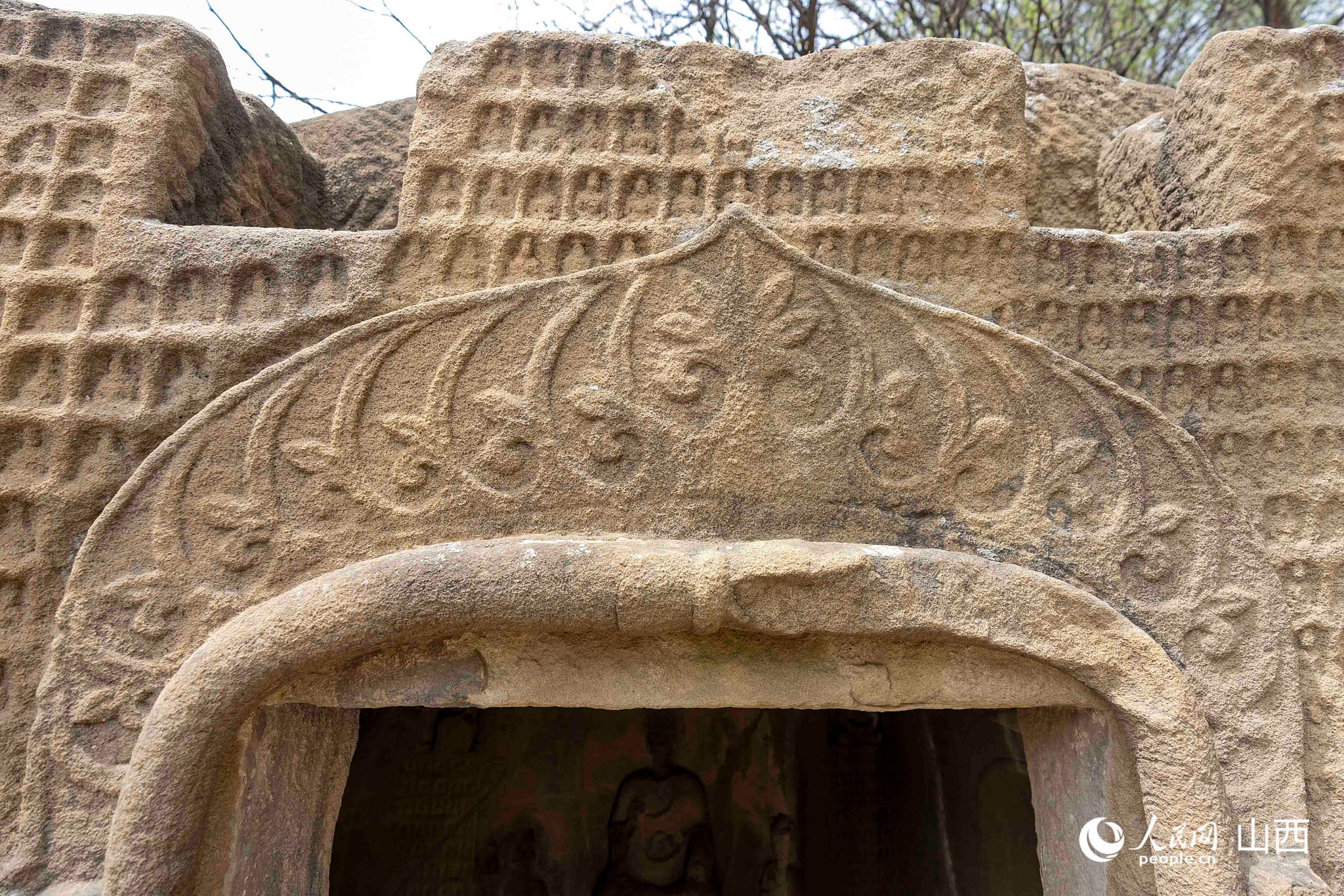 龕楣忍冬紋裝飾,窟門外雕回首鳳鳥。