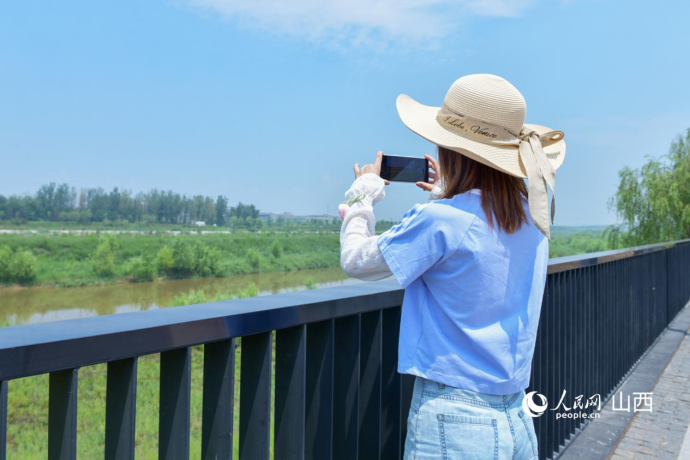 游客打卡介休汾河國家濕地公園。人民網記者 焦搏文攝