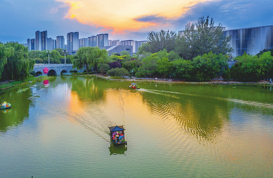 8月13日,晉中市晉商公園內,市民在湖里泛舟游覽,享受清涼。近年來,晉中市因地制宜建設了一批綠地、公園,拉近市民與大自然的距離,不斷提升市民幸福感。(邢蘭富攝)