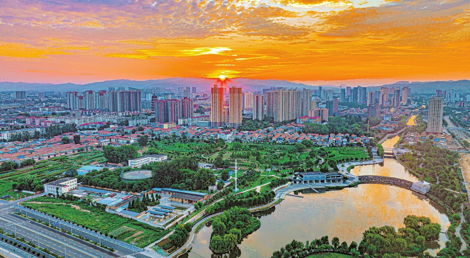 8月20日,長治市潞州區,朝霞與城市公園、道路、民居交相輝映,美不勝收。近年來,該市通過雨污分流改造、河道清淤、生態修復等工程,恢復水體生態,并打造親水步道、景觀公園,建設橡膠壩蓄水成景,讓一河秀水成為扮靚古城、造福百姓的生態紐帶。(郭世虎攝)