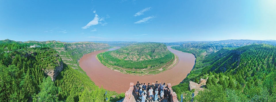 8月19日,游客在永和縣乾坤灣景區游覽觀光、合影留念。近年來,該縣不斷提高當地森林覆蓋率,并依托紅色旅游資源發展文旅經濟,把東征村156孔窯洞改造成民宿旅館,增加了村集體和村民收入。(李虎威攝)