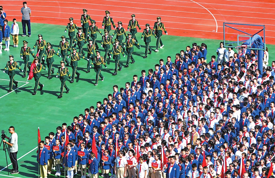 9月1日,長治市潞州區建東小學舉行以“銘記與奮斗”為主題的新學期首次升旗儀式暨“開學第一課”,引導廣大青少年銘記歷史、緬懷先烈、珍愛和平、開創未來。(梁棟 攝)