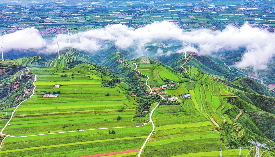 9月4日,俯瞰夏縣瑤峰鎮大山深處,云霧氤氳,一座座風機葉片迎風轉動,層層疊疊的梯田宛如黃綠色的地毯鋪展開來,民居點綴其間,構成一幅充滿詩意的秋日畫卷。(姚中吉 攝)