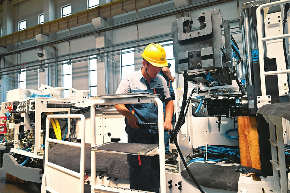 9月8日,中國煤炭科工集團太原研究院有限公司內,工作人員正在組裝煤礦掘錨一體機。據了解,該公司主要從事煤礦開采、掘進、運輸、支護技術與裝備的研究和開發,是國內專業配置最齊全的高端煤機裝備科創企業之一,同時開展礦山工程承包、設備大修、專業化服務等業務。(記者阮洋攝)